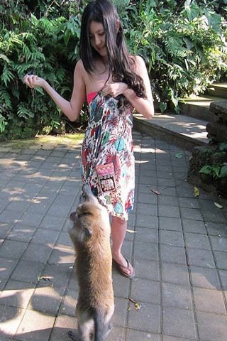 Trong chuyến thăm Thánh địa Khỉ ở Bali, Indonesia hồi tháng trước, Charmian Chen (22 tuổi) đã bị hai con khỉ nghịch ngợm, tham ăn đang cố tìm kiếm ngô rơi trên người cô đã vô tình kéo tụt cả chiếc váy rực rỡ và đơn giản mà cô đang mặc xuống phía dưới làm lộ phần ngực của Chen.