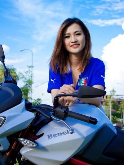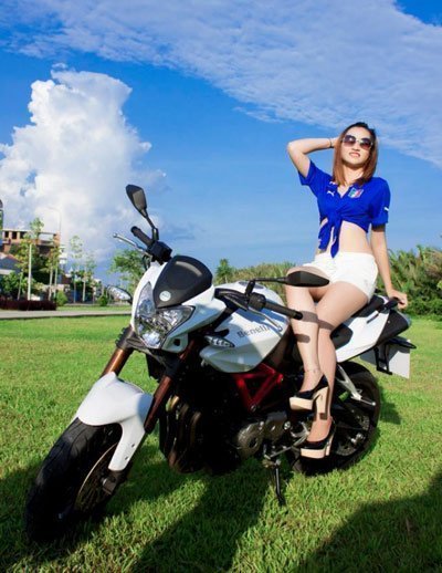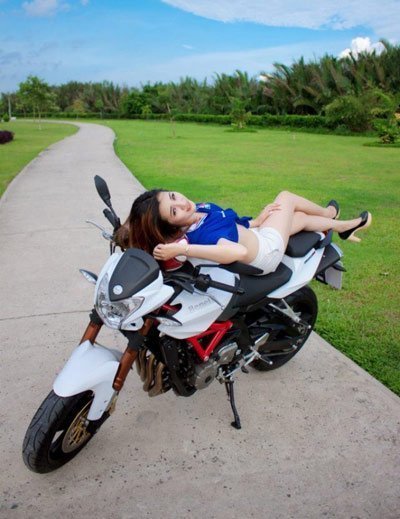 | Bộ đồ cá tính sánh vai cùng chiếc xe "siêu bò" Benelli, Ngọc Trang nổi bật với tông áo màu xanh, kết hợp với nền xanh của trời, màu trắng của mây |
