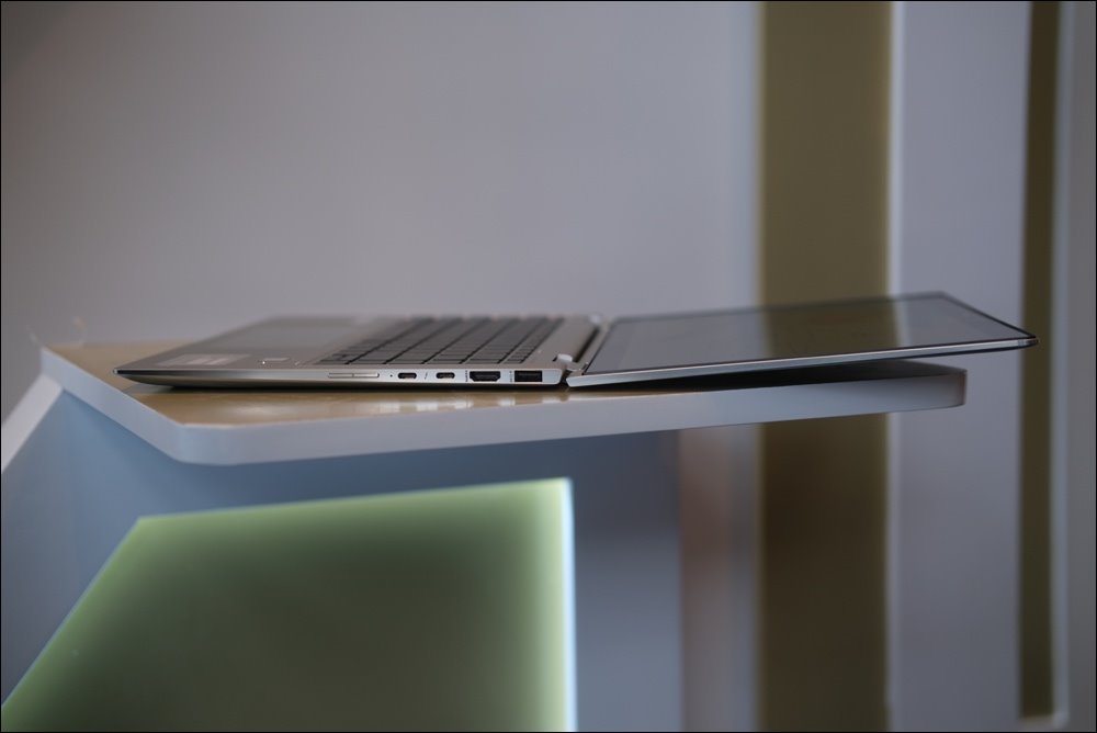 Máy có cổng USB-C được bố trí ở góc phải giúp người dùng dễ dàng quản lí cáp nối, cùng thiết kế vát kép cho phép thao tác mở máy được từ cả ba phía.
