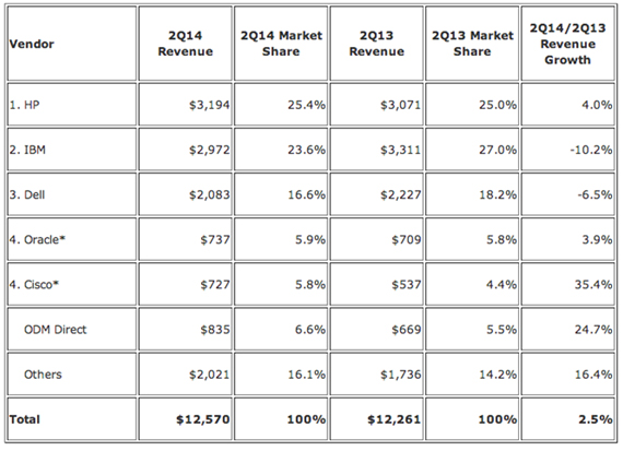 Cũng trong báo cáo của IDC, IBM đạt được doanh thu 2,97 tỷ đô la và bám khá sát HP với 23,6% thị phần. Doanh thu của IBM đã giảm hơn 10% năm sau so với năm trước ở ngưỡng cửa của một chu kỳ làm mới công nghệ và trong vòng hơn hai năm, doanh thu máy chủ của IBM đã sụt giảm hơn 19%. Máy chủ chiếm khoảng 15% tổng doanh thu của IBM vào năm 2012 và 13% vào năm 2013.