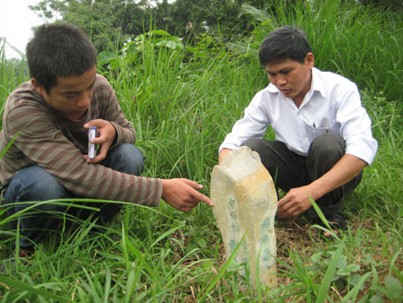 | Gia đình ông Dũng vô tình phát hiện tấm bia này khi làm cỏ mộ |