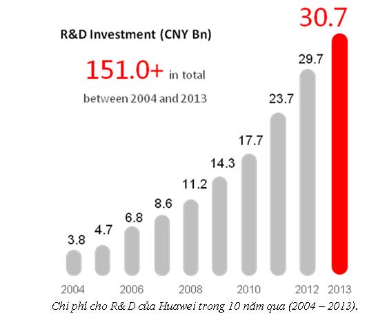 Sự sáng tạo không ngừng nghỉ cũng được coi là nền tảng quan trọng cho sự tăng trưởng hiệu quả của Huawei. Trong năm 2013, Huawei đã đầu tư 30,7 tỉ CNY (tương đương khoảng 5,06 tỉ USD) cho các hoạt động nghiên cứu và phát triển (R&D), chiếm khoảng 12,8% doanh thu. Tổng đầu tư cho R&D của Huawei trong 10 năm qua đã vượt mức 151 tỉ CNY. Huawei sáng tạo dựa trên các nhu cầu của khách hàng và sẽ tăng cường đầu tư vào các công nghệ khoa học và kỹ nghệ cơ bản cần thiết để duy trì vị trí dẫn đầu trong các công nghệ ICT cốt lõi.