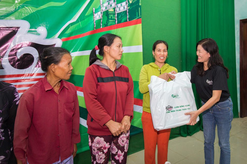 Bà Trương Thị Thu Dung – đại diện Carlsberg Việt Nam trao những phần quà nghĩa tình đến bà con vùng lũ.