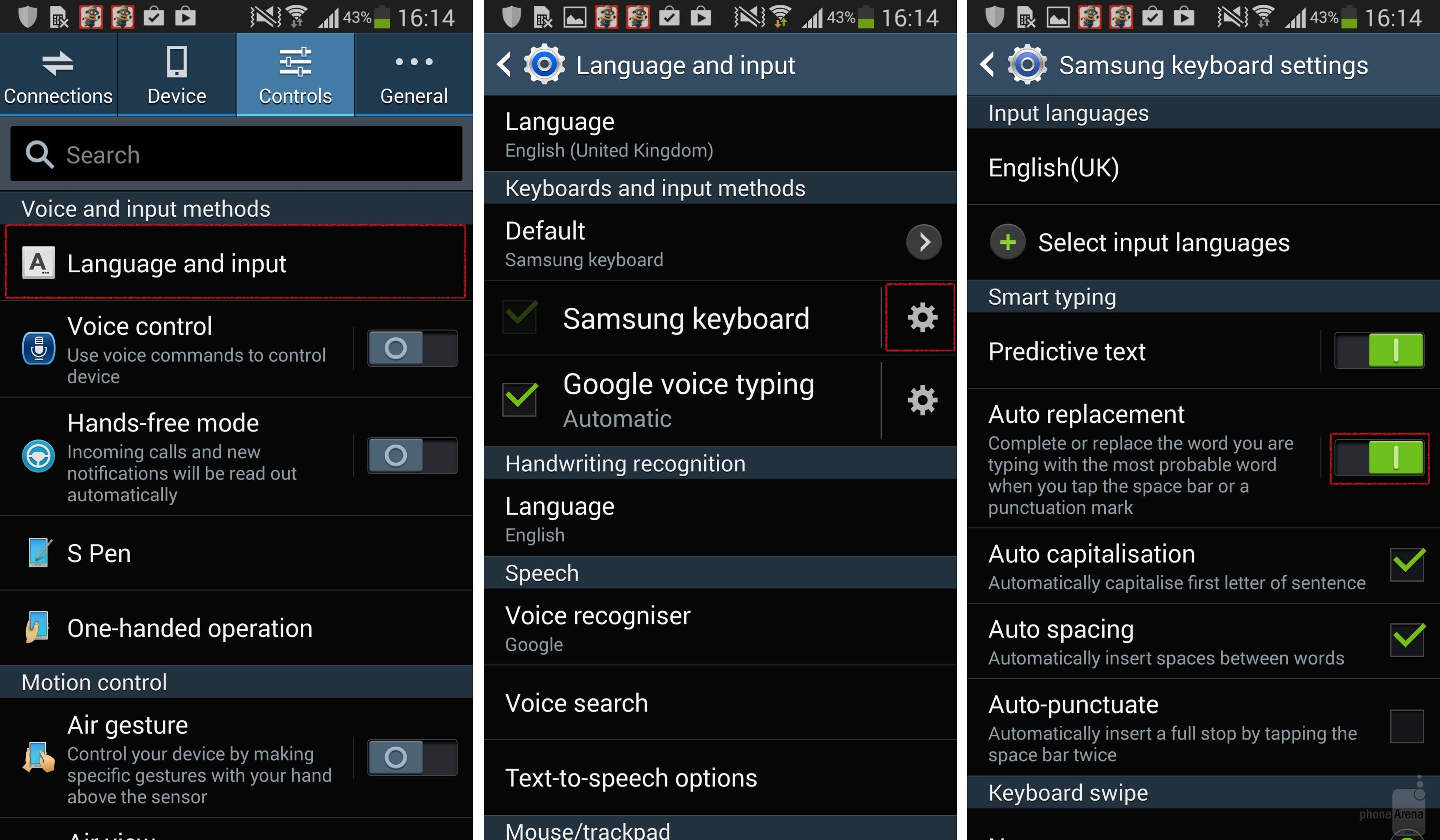 Samsung Galaxy Note 3: Cài đặt > Ngôn ngữ và kiểu nhập > Bàn phím Samsung > Tự động thay thế > Bật/Tắt.
