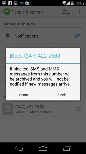 Lưu ý: bạn cần đặt Hangouts làm ứng dụng nhận tin SMS mặc định mới có thể sử dụng được chức năng chặn tin nhắn. Thao tác bằng cách vào Settings từ ứng dụng Hangouts > Turn on SMS và làm theo hướng dẫn.