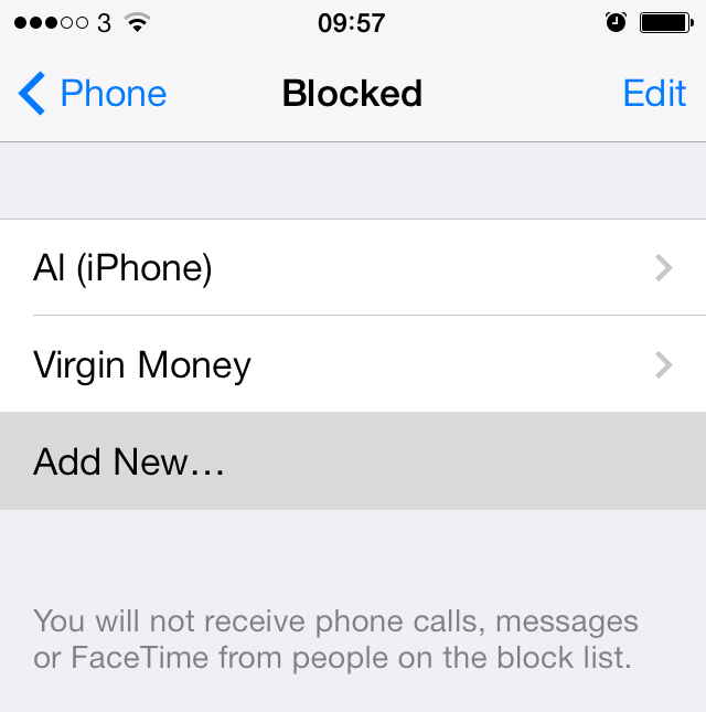 Còn cách thứ hai là bạn chặn số từ ngày trong danh bạ (Contacts). Trước tiên, bạn vào Settings > kéo xuống dưới và chọn Phone > Blocked > Add New > tìm số điện thoại thường gửi tin nhắn rác có trong danh bạ để bắt đầu chặn.