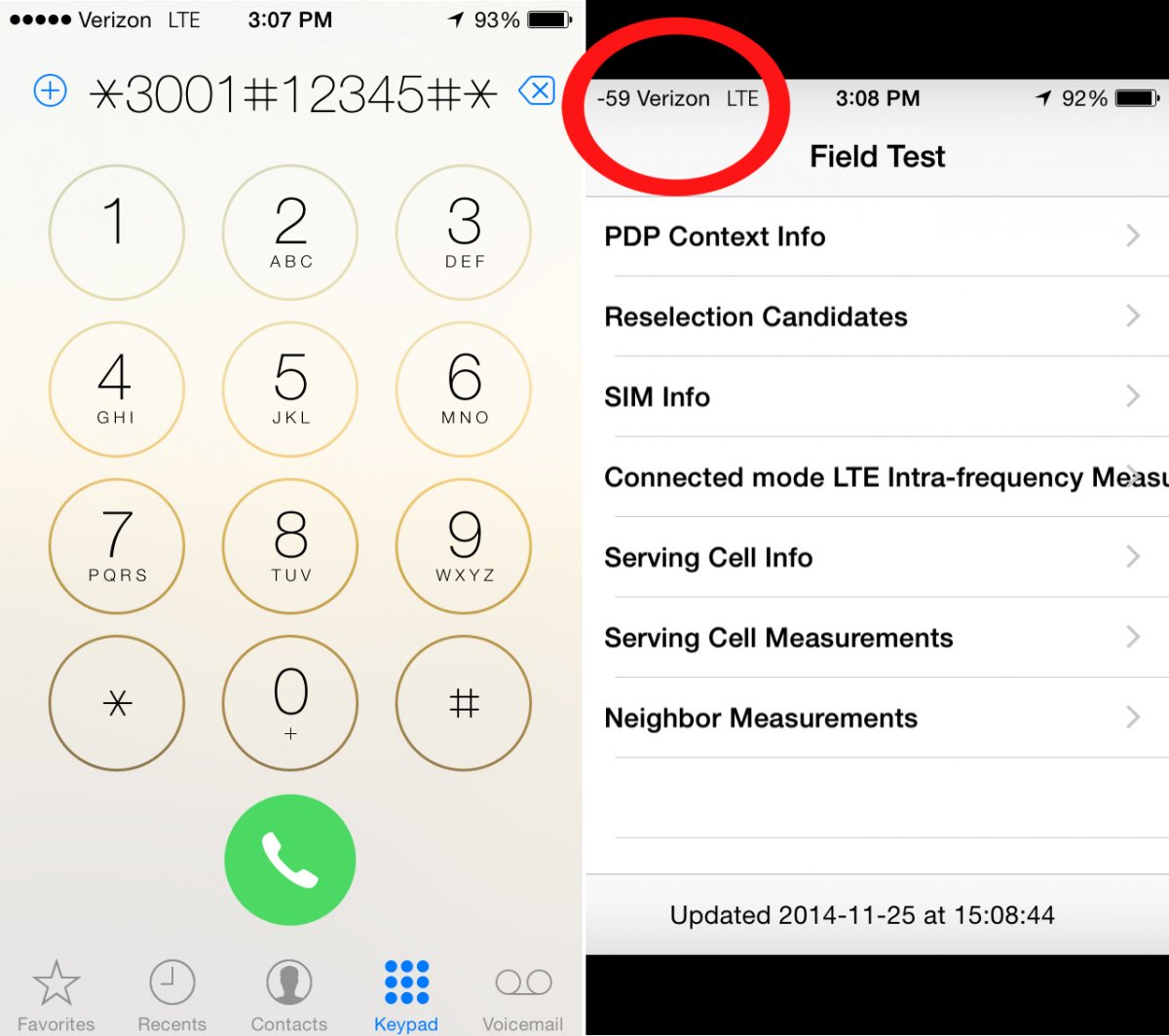 Đầu tiên, bạn cần mở ứng dụng ẩn trên iPhone có tên Field Test Mode bằng cách mở ứng dụng gọi điện (Phone), quay số *3001#12345#*rồi chọn Gọi (Call). Hành động này sẽ mở ra Field Test Mode với một số thông tin khác nhau. Điều duy nhất cần quan tâm là con số ở góc trên cùng bên trái màn hình iPhone, thay thế các cột sóng.