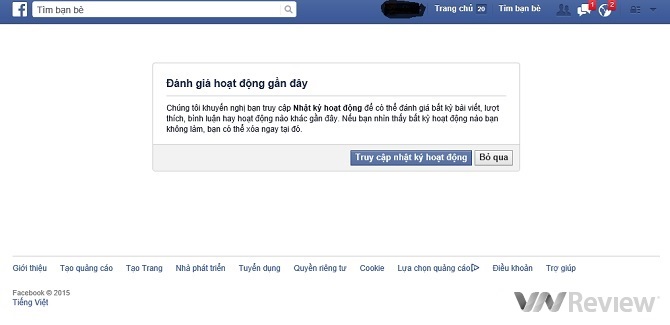 Bước 8: Đến bước thứ tám, người dùng có thể tùy chọn truy cập vào nhật ký hoạt động luôn để theo dõi tình trạng tài khoản sau khi bị hack ra sao hoặc cũng có thể nhấn Bỏ qua để truy cập vào Trang chủ.