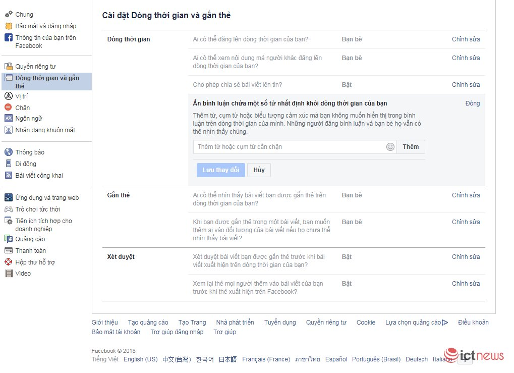 Bước 4: Nhìn sang cột trung tâm, bạn nhìn thấy dòng “Ẩn bình luận chứa một số từ nhất định khỏi dòng thời gian của bạn”. Bấm vào “Chỉnh sửa”.