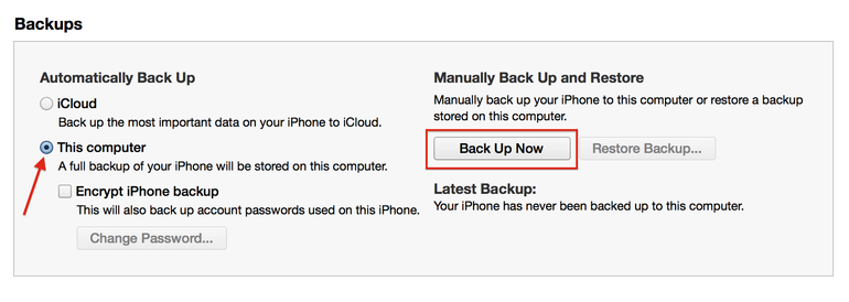 Với cách đầu tiên, bạn cần phải cài đặt phiên bản iTunes mới nhất. Bạn kết nối iPhone, iPad với máy tính bằng dây USB, chọn thiết bị rồi click vào tab Summary ở menu trên cùng. Đảm bảo máy tính của bạn đã được chọn rồi nhấn nút Back Up Now ở bên phải. Nếu muốn backup dữ liệu lên đám mây, chọn iCloud ngay phía dưới tùy chọn máy tính.