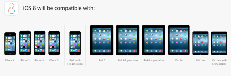 Nếu đang dùng iPad thế hệ đầu hoặc iPhone 4, bạn cần mua thiết bị đời mới hơn để nâng cấp iOS 8 vì không phải mọi sản phẩm Apple đều tương thích với phiên bản này. Theo Apple, chỉ những cái tên sau mới nhận được cập nhật: iPhone 4s, iPhone 5, iPhone 5s, iPhone 5c, iPad 2, iPad thế hệ ba và bốn, iPad Air, iPod Touch thế hệ 5, iPad mini, iPad mini Retina.