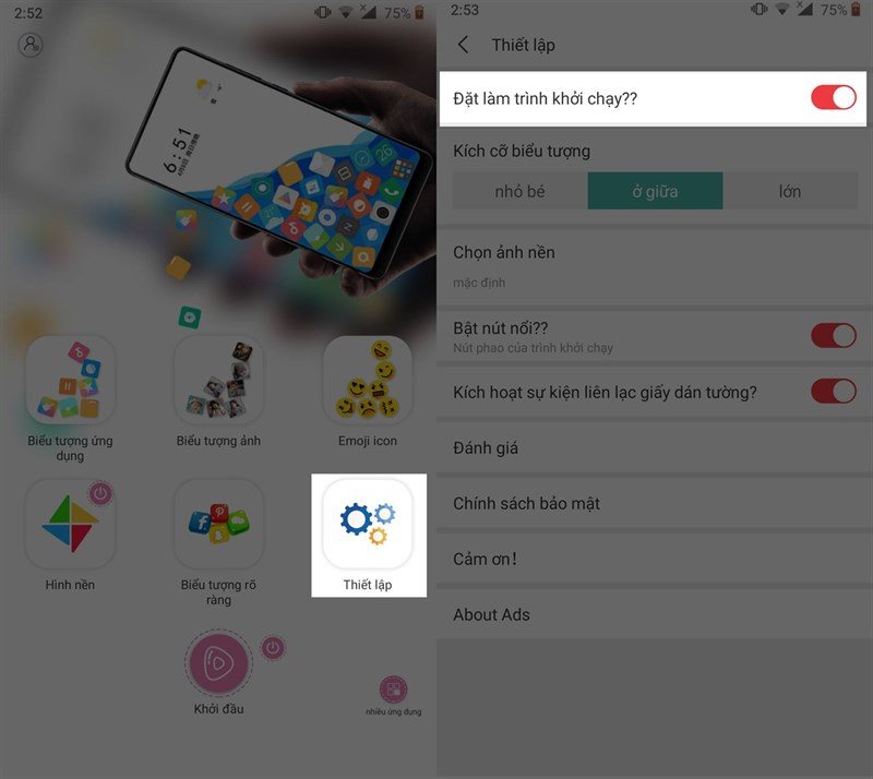 Khi vào được màn hình chính bạn chọn vào Thiết lập, bật Đặt làm trình khởi chạy. Còn lại những thiết lập như hình nền, kích cỡ bạn có thể tự cài đặt tùy ý.