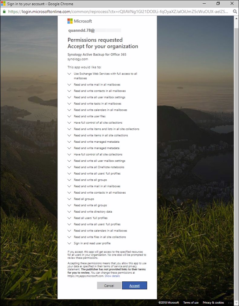 Một danh sách dài các yêu cầu cần được cấp quyền từ account quản trị hiện ra, bạn chỉ việc chọn Accept để đi đến bước tiếp theo.