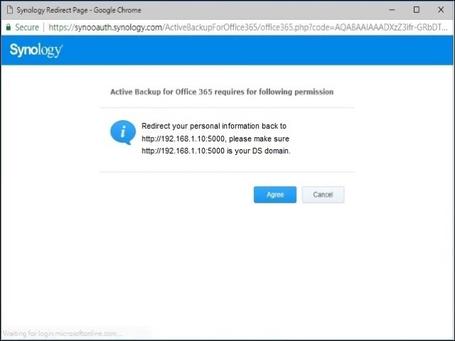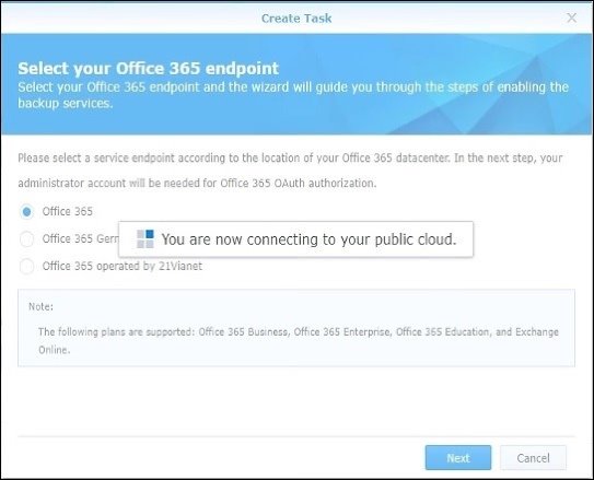 Sau khi bạn đã chọn loại tài khoản Office 365, đăng nhập và được cấp quyền, Active Backup for Office 365 sẽ bắt đầu kết nối với public cloud