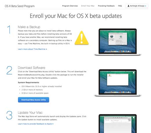 Bước 4: Sau khi đồng ý, một trang khác mở ra, chọn “Download Beta Access Utility” để tải về. Apple khuyên người dùng backup dữ liệu trước khi cài đặt.