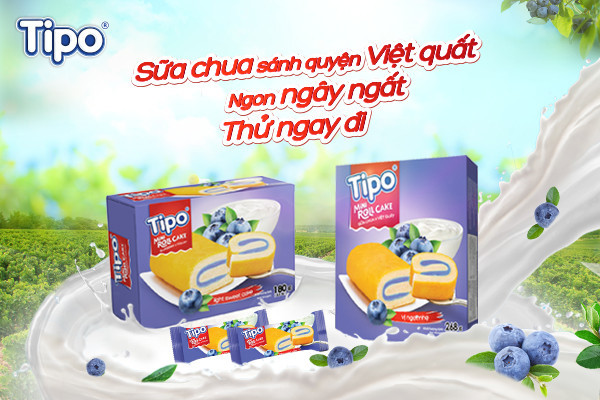 Đây cũng là sản phẩm bánh bông lan vị sữa chua việt quất tiên phong ra mắt tại thị trường Việt Nam. Bên cạnh đó, Tipo Bánh Bông lan cuộn Kem Sữa chua và Việt quất có bao bì màu tím bắt mắt, phong cách thiết kế tươi mới, trẻ trung, thể hiện sắc đặc trưng của nguyên liệu sữa chua và việt quất, kích thích mọi ánh nhìn.