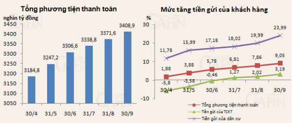 Theo số liệu Ngân hàng Nhà nước công bố, hết tháng 9/2012, tổng phương tiện thanh toán đạt gần 3.048,9 nghìn tỷ đồng, tăng 1,1% so với cuối tháng trước và tăng 9,05% so với cuối năm 2011.