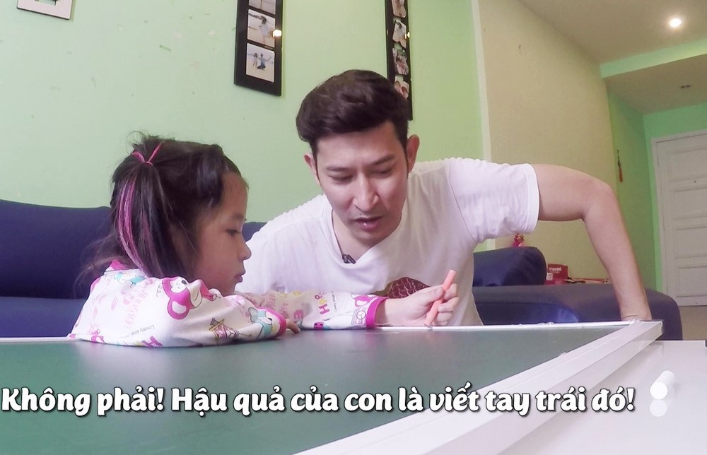 Huy Khánh không hài lòng khi Cát Cát viết chữ bằng tay trái nhưng thay vì ép buộc, anh kiên nhẫn giải thích và rèn cho con gái tập làm quen với cách viết bằng tay phải.