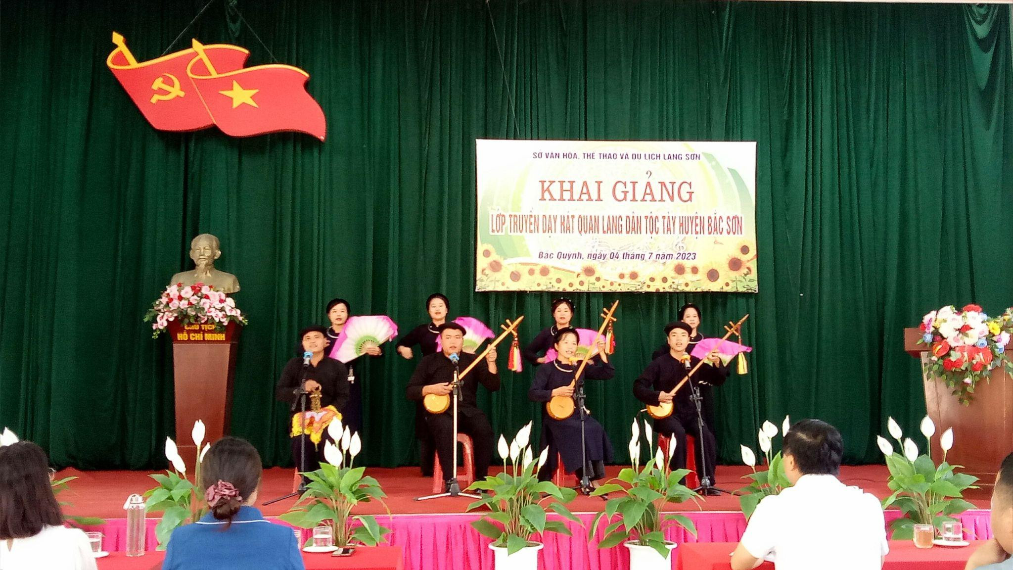 Theo đó, 20 học viên là cán bộ, nhân dân của 2 xã Long Đống và Bắc Quỳnh được các nghệ nhân truyền dạy trong 40 buổi về kỹ năng thực hành, trình diễn, tái hiện một số nghi thức, làn điệu hát Quan Lang dân tộc Tày trong sinh hoạt, đời sống, tập quán xã hội, đặc biệt là trong đám cưới người Tày địa phương.