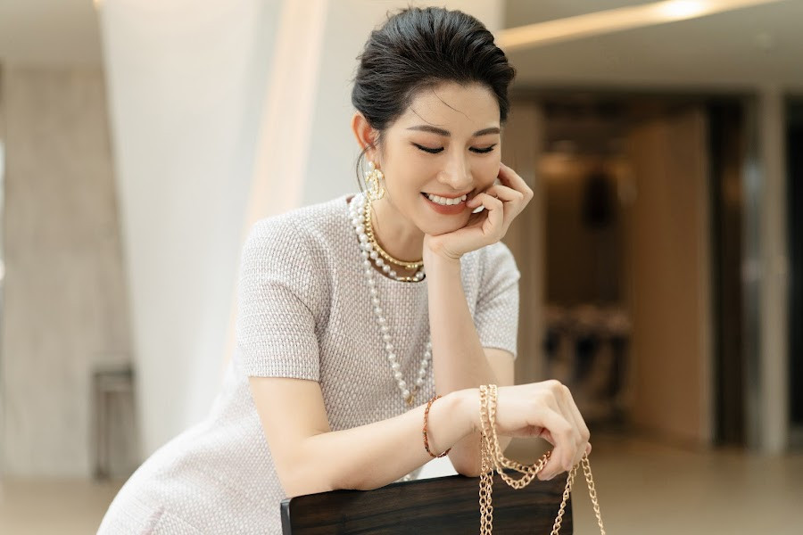 “Trang không thích trang phục quá “bánh bèo”, thích thời trang thanh lịch, gọn gàng, áo có tay, khoét cổ hở xương quai xanh tạo sự gợi cảm và thanh lịch”, Huyền Trang chia sẻ thêm về gu ăn mặc.