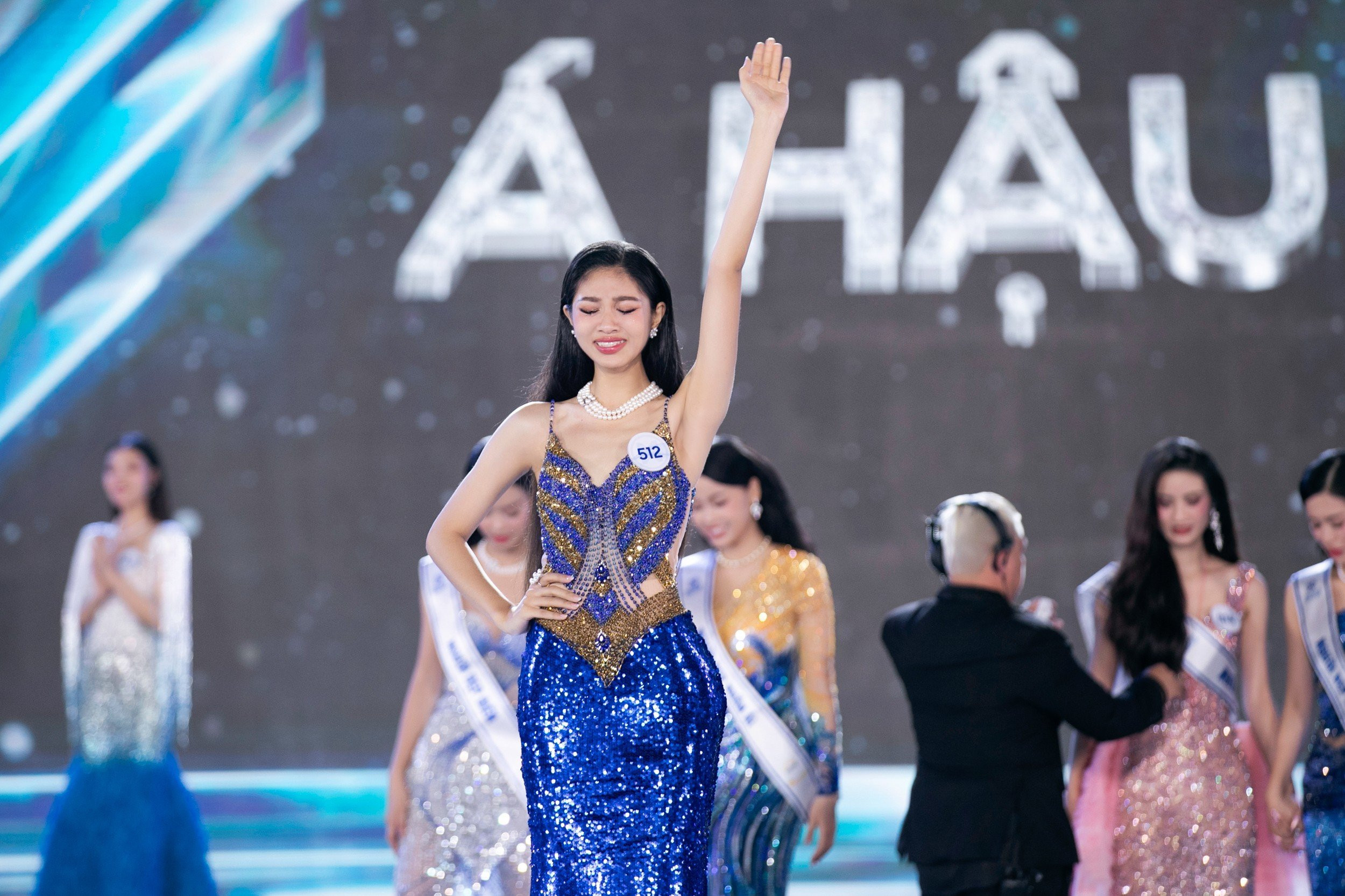 Huỳnh Minh Kiên bật khóc tiến ra sân khấu không tin được kết quả dành cho mình. Cô sinh năm 2004, là sinh viên năm nhất ngành Quản trị kinh doanh của Đại học Nông lâm TP.HCM sở hữu chiều cao 1,71m, số đo ba vòng 80-61-90cm.