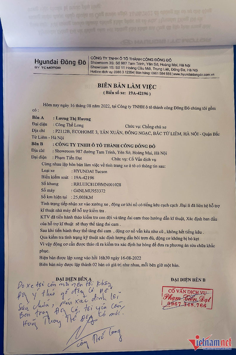Đến ngày 16/8, dù đã được sự hỗ trợ từ KTV nhà máy Hyundai Thành Công kiểm tra con đội và đai cam, sau đó, thay thế cả đai cam nhưng hiện tượng động cơ kêu lạch cạch của chiếc xe vẫn không được khắc phục.
