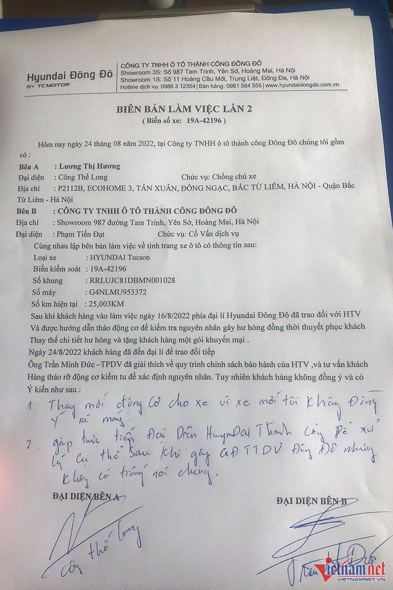 Khổ chủ trong tình huống này là anh Công Thế Long, một người kinh doanh rượu vang có tiếng tại Hà Nội. Phản ánh tới VietNamNet, anh Long cho biết, vợ chồng anh mới mua xe Hyundai Tucson 2022 được hơn nửa năm, hợp đồng ký ngày 27/12/2021. Xe đã đi được 25.003 km và trải qua 5 đợt bảo dưỡng định kỳ.