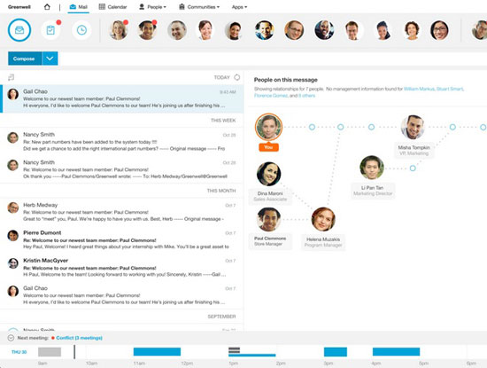 Ngoài ra, IBM Verse được tích hợp các công cụ phân tích để cung cấp một màn hình tổng quan, liệt kê một cách thông minh tất cả mọi hoạt động quan trọng trong ngày của một người dùng.