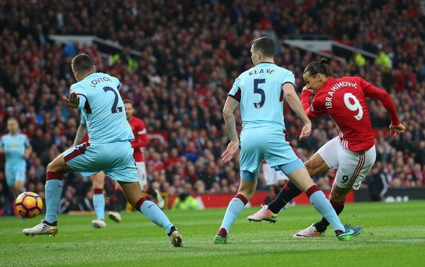 Sau cú xoạc bóng của hậu vệ Burnley, Ibrahimovic quăng chân sút góc hẹp nhưng hậu vệ đội khách đã truy cản thành công.