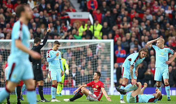 Herrera phạm lỗi với cầu thủ Burnley nhận thẻ vàng thứ hai rời sân. Lúc này Quỷ đỏ chỉ còn chơi với 10 người.