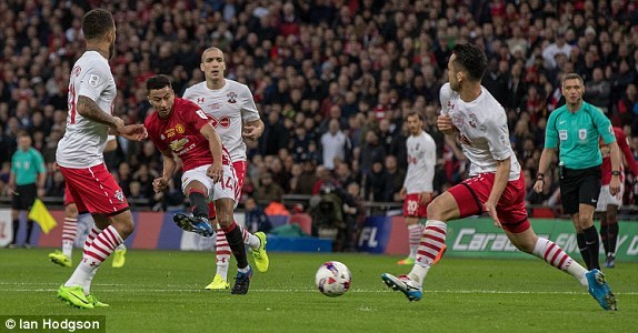 Đang đá lấn sân, Southampton bất ngờ để thua bàn thứ 2. MU phối hợp lên bóng khá hay bên cánh trái, Marcos Rojo chuyền ra cho Lingard ở vị trí thuận lợi sát vòng cấm địa. Tiền vệ người Anh đặt lòng hiểm hóc vào góc xa nhân đôi cách biệt.