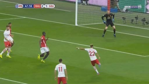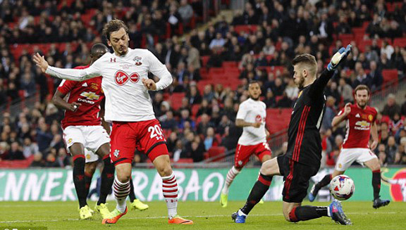 Southampton đưa ra câu trả lời đanh thép. Cedric thoát xuống bên cánh phải rồi căng ngang vào trong cho Gabbiadini đệm cận thành tung lưới De Gea. May cho MU là trọng tài biên phất cờ báo hiệu việt vị.