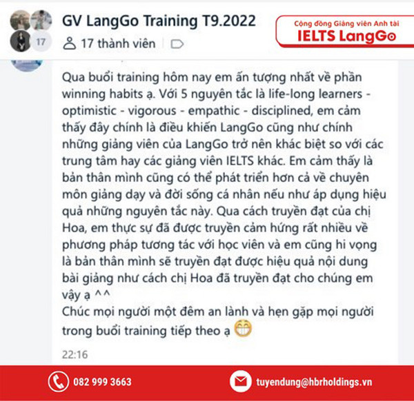 Cô Diệu Hoa - Nhà đồng sáng lập, Giám đốc phát triển sản phẩm của IELTS LangGo chia sẻ: “Hệ thống luôn hoạt động với phương châm đầu tư vào nguồn nhân lực - đội ngũ giảng viên anh tài là ưu tiên hàng đầu. Mỗi năm, các giáo viên tại IELTS LangGo được tham dự nhiều khóa đào tạo/hội thảo nhằm phát triển bản thân cả về kiến thức và kỹ năng. Điểm sáng của chuỗi chương trình chính là ngoài nắm vững các lý thuyết, thầy cô sẽ được thực hành và phản hồi để cải thiện kỹ năng sư phạm, tạo ra những tiết học đạt hiệu quả cao”.