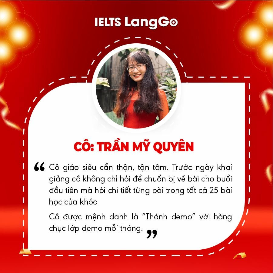 Cùng với cô Hồng Phương, cô Trần Mỹ Quyên cũng được đánh giá là giáo viên có chuyên môn cao và luôn tận tâm với các học viên của mình. IELTS LangGo là nơi cô lựa chọn để gắn bó và hiện thực hóa khát vọng giúp nhiều người tự tin làm chủ tiếng Anh.
