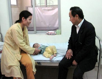 | Ông Morita Nguyễn - Giám Đốc Kinh doanh công ty TNHH INAX Việt Nam đến thăm hỏi và động viên cháu bé Bùi Thị Thanh Trúc, tại bệnh viện Tim - Hà Nội |