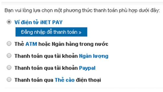 Cổng thanh toán iNET Pay hỗ trợ nhiều hình thức thanh toán, nạp tiền khác nhau, như thẻ quốc tế (Visa, MasterCard), thẻ ngân hàng, thẻ cào điện thoại, tin nhắn SMS; hệ thống thanh toán: Paypal, Ngân lượng, SMS.vn...