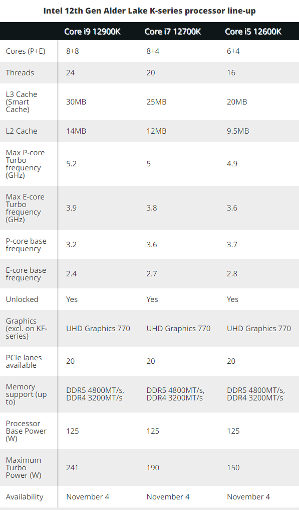 Intel Core thế hệ thứ 12 sẽ bắt đầu được bán ra trên toàn cầu từ 4/11 với mức giá từ 264 USD đến 589 USD tương ứng với phiên bản thấp nhất i5-12600K và cao cấp nhất i9-12900K.