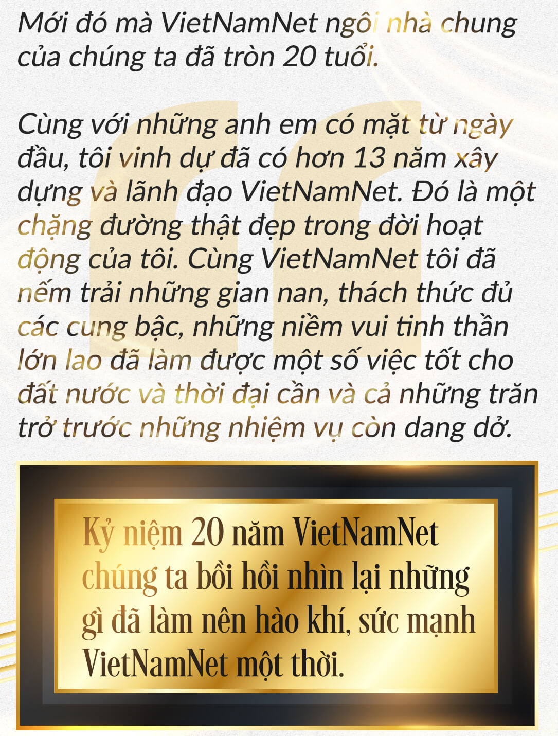 Đó là con đường vinh quang nhưng cũng đầy thách thức, vì đất nước những ngày ấy đang ở trong giai đoạn chuyển đổi nên cái mới không phải lúc nào cũng được đồng tình và ủng hộ. Chúng ta chấp nhận những thách thức đó. Và hơn nữa, đã biết vượt qua các thách thức, đã xây dựng được uy tín một thời của VietNamNet, như một cơ quan ngôn luận trung thực, đổi mới, thẳng thắn, có trách nhiệm, dũng cảm và đáng tin cậy. VietNamNet đã có đóng góp vào sự nghiệp đổi mới đất nước, vào việc thức tỉnh và nhận diện những vấn đề sống còn của đất nước.