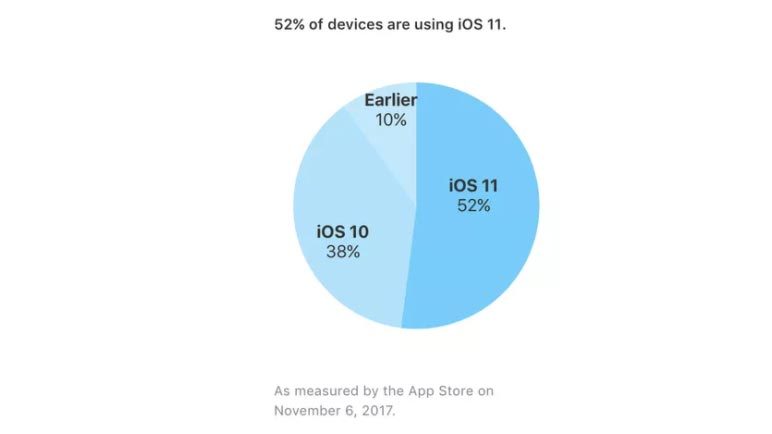 iOS 11, phiên bản hệ điều hành mới nhất của Apple dành cho iPhone và iPad, hiện được cài đặt trên 52% số thiết bị iOS, theo thông tin mới cập nhật trên trang hỗ trợ các nhà phát triển của cửa hàng trực tuyến Apple App Store.