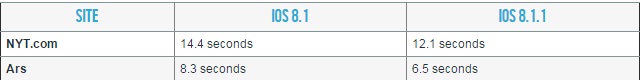 iOS 8.1.1 đã giúp cải thiện hiệu năng ở một số mặt, tuy nhiên bản cập nhật này đã không giải quyết được các vấn đề về độ nhạy (responsiveness) và độ nhất quán (consistency). Cụ thể, trang công nghệ này cho biết thời gian mở các ứng dụng hệ thống (ứng dụng mặc định mà Apple cài trên máy) như Safari, Camera, Message, là gần như không thay đổi so với iOS 8.0. Safari có được cải thiện chút ít tuy nhiên nhìn chung thời gian tải của các ứng dụng này vẫn còn cao so với iOS 7.1.2. Như chúng ta có thể thấy từ bảng thống kê bên dưới, người dùng mất 1,85 giây để mở Safari, 1,84 giây để mở Camera...trên iOS 8.1.1, lâu hơn so với iOS 7.1.2 (mất 1,25 giây để mở Safari, 1,5 giây để mở Camera). Tình trạng lag cũng xảy ra khi mở bàn phím hay trung tâm thông báo (Notification Center).
