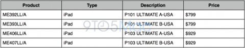 Cụ thể, trong danh sách SKU bị rò rỉ, hai tên mã P101 và 103 tương ứng với phiên bản Wi-Fi và LTE của iPad mới. Trong quá khứ, Apple từng đặt tên dung lượng lưu trữ khác nhau là "Tốt", "Tốt hơn", "Tốt nhất" dựa trên bộ nhớ 16GB, 32GB hoặc 64GB. Tuy nhiên năm nay, trong danh sách còn xuất hiện thêm một model mới với tên "Tối thượng" (Ultimate), báo hiệu sự tồn tại của một phiên bản 128GB.