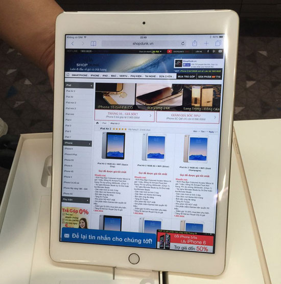 Trao đổi với ICTnews, anh Lê Nguyễn Việt Đức, Giám đốc hệ thống siêu thị di động ShopDunk cho hay: Trong đợt hàng về Hà Nội chiều nay, hệ thống này đưa về số lượng hạn chế iPad Air 2 4G + Wi-Fi bản dung lượng 128GB và 64GB màu Gold Champage, máy được mua từ Hồng Kông.