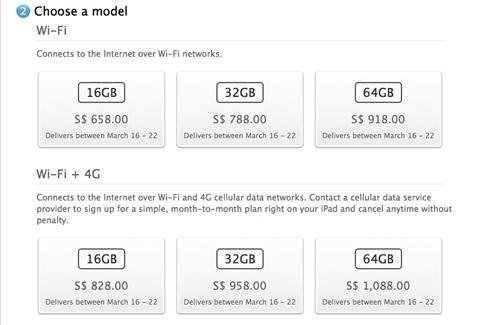 | Giá iPad mới tại website của Apple Singapore và sẽ giao hàng từ 16/3 tới. |