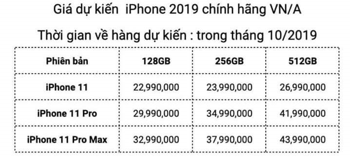 Theo đó, iPhone 11 phiên bản 128GB có giá rẻ nhất, dự kiến 22,99 triệu đồng. Trong khi đó, mẫu iPhone 11 Pro Max bản 512GB có giá cao nhất, 43,99 triệu đồng.