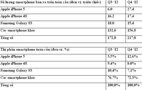 Theo số liệu thống kê của Strategy Analytics, trong quý 4/2012, Apple đã bán được 27,4 triệu chiếc, chiếm gần 13% thị phần smartphone toàn thế giới đẩy Galaxy S3 xuống vị trí thứ 3 với chỉ 7% thị phần và số lượng bán ra của S3 cũng chỉ còn ở mức 15,4 triệu chiếc.