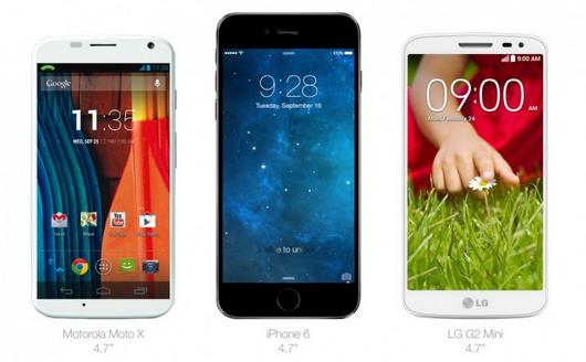Đầu tiên là iPhone 4.7 inch đặt cạnh Motorola Moto X 4.7 inch và LG G2 mini 4.7 inch. Mặc dù 3 mẫu điện thoại có cỡ màn hình giống nhau, iPhone 6 trông cao hơn hai thiết bị còn lại: