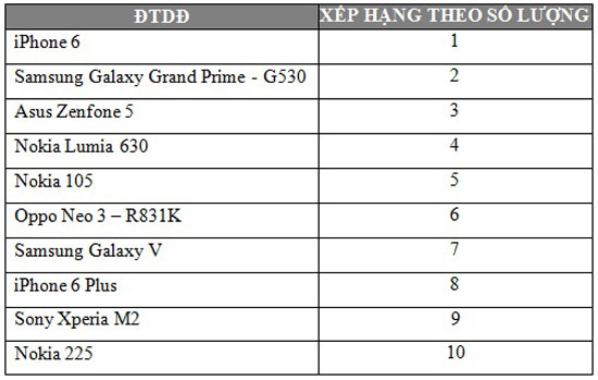 Bên cạnh đó, loạt sản phẩm của Samsung như Galaxy Grand Prime, Galaxy Note 4, Galaxy Note 3 Neo cũng chiếm ưu thế. Các vị trí còn lại thuộc về sản phẩm của Asus Zenfone 5, Sony Xperia M2, Oppo Neo 3 và Nokia Lumia 630.