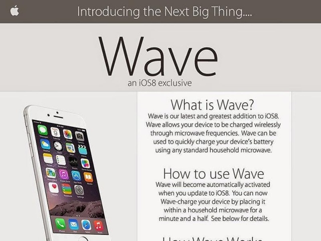 Một nhóm người tinh nghịch đã tạo ra một trang web sản phẩm trông giống như trang web chính thức của Apple, miêu tả tính năng Apple Wave – một tính năng cực kỳ cách mạng, giúp sạc nhanh pin cho iPhone 6 và đó là một tính năng cập nhật của iOS 8. “Wave là sự bổ sung mới nhất và tuyệt vời nhất cho iOS 8”, trang quảng cáo giả mạo nói. “Wave giúp thiết bị iOS 8 của bạn có thể sạc pin cực nhanh, chỉ trong 1 phút rưỡi đã đầy pin. Chỉ cần để thiết bị vào lò vi sóng”.