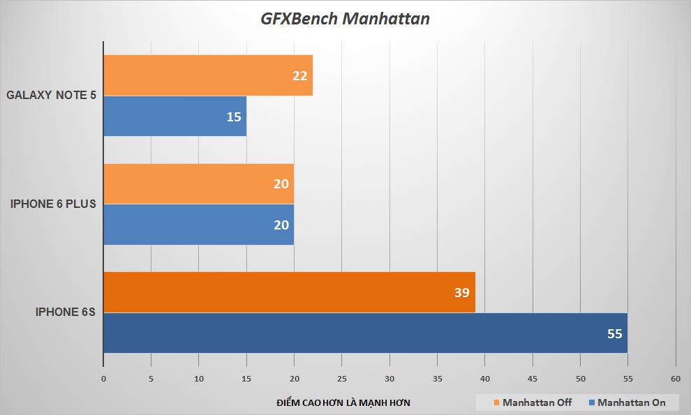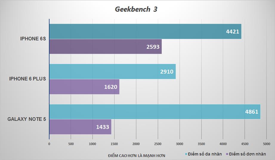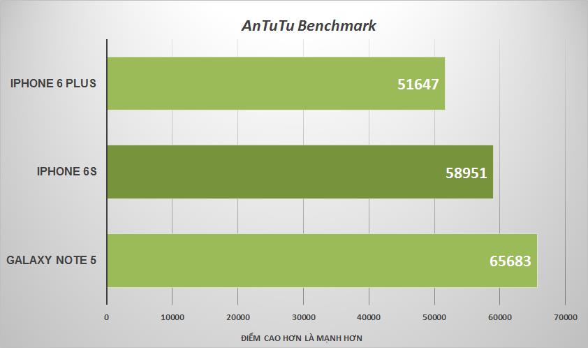 Tuy nhiên, hiệu năng tổng thể hệ thống đo bằng AnTuTu của iPhone 6S không hơn nhiều so với 6 Plus và vẫn kém hơn Galaxy Note 5.