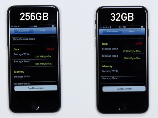 Màn hình, các vi xử lý và hình dạng của các phiên bản iPhone nói trên được tuyên bố là giống hệt nhau. Tuy nhiên, người ta vừa phát hiện giữa chúng có một vấn đề lớn: iPhone 7 bản 256GB có tốc độ ghi nhanh hơn nhiều so với iPhone 7 bản 32GB, theo một số kết quả kiểm tra sức mạnh thiết bị phần cứng (benchmark) trên các máy đang sử dụng.